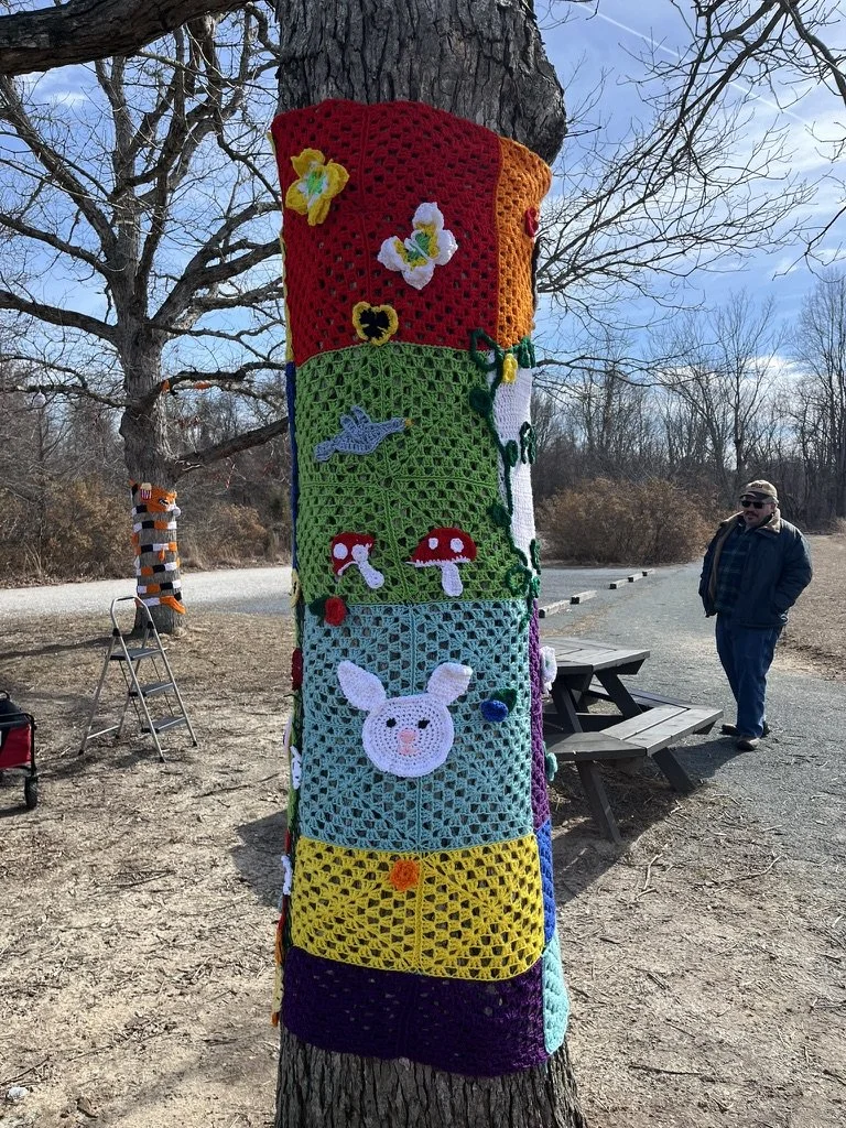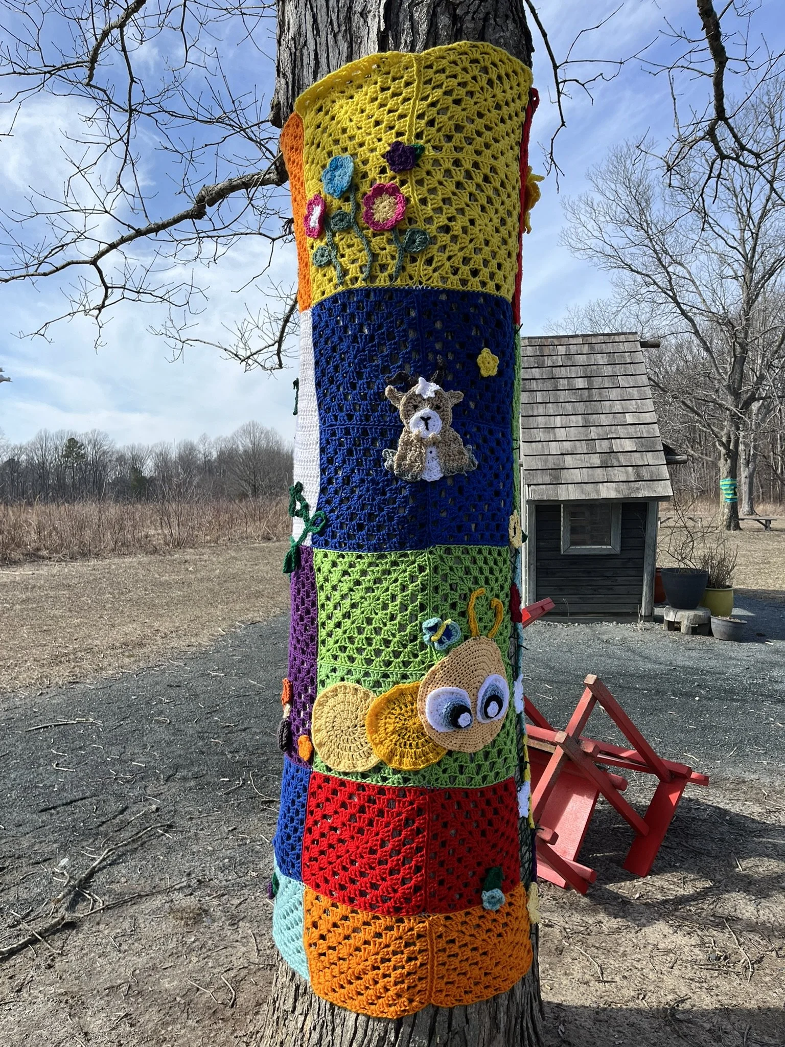 I wrapped this same tree on the arboretum grounds in 2023. This year, I took the same base of 44 granny squares and one double crochet block and stitched elements to represent the various things you might find along a forest path at Adkins. This included a rabbit, owl, caterpillar, flowers, butterflies and mushrooms.